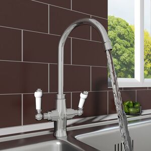 Two White Handle Mono Kitchen Sink Mixer Tap This long neck kitchen tap has two handles, perfect for accurate temperature control every time. The traditional style makes it the perfect addition to any classic kitchen. Manufactured with quality and style in mind, Our long neck kitchen tap also comes with a 10 year 'Fit & Forget' guarantee. Ceramic Disc Technology Older style taps used rubber washers over time these washers degraded and no matter how much you turned the tap you would still have a dripping tap. With our Ceramic Disc taps all you need to do is turn the tap a 1/4 turn and the tap is off. Ceramic Discs don’t wear out - which means dripping taps are a thing of the past! Two White Handle Mono Kitchen Sink Mixer Tap Features: Modern Design Made from Solid Brass Single water outlet Quarter turn ceramic disc technology Easy to use Lever Handles Supplied with Flexible Connectors Swivel spout for use on single and multiple bowl sinks Minimum Pressure: 0.5bar Maximum Pressure: