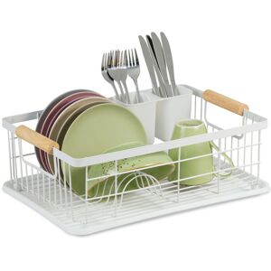 Save time hand-drying dishes by setting them in this practical dish drainer after washing them! The large stainless steel dish rack provides ample space for plates and cups. The cutlery basket is divided into 3 compartments so you can separate knives, forks and spoons. The top part of the dish drainer is perfect for setting dishes to dry. The functional and shiny design of the dish stand looks lovely in any kitchen. Details on the Dish Drainer with Cutlery Basket • Total size: HxWxD: approx 23.5 x 48 x 32 cm (fully set up) • Cutlery basket with hanging mechanism and drip holes • Outer size of 3-part cutlery basket: HxWxD: approx 10 x 12.5 x 5 cm (height back wall) • Attachable dish drainer: HxWxD: approx 13 x 26 x 31 cm (10 dish holders) • Drip tray: approx 48 x 32 cm • Weight: approx 2 kg • Material: Stainless steel • Colour: Silver Draining Basket, Tray and Cutlery Basket in One • Air-dry your dishes • No puddles on your countertops • Dish water collects in tray • Chic and