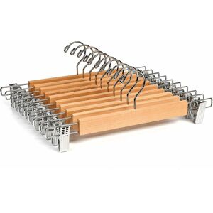 Set of 10 premium lotus wood skirt and pants hangers. Smooth surface protects your hands and clothes from abrasion. Non-slip steel clips with padded grippers for hanging skirt from pants A 360-degree chrome hook allows users to easily hang clothes from any angle. Sturdy hardwood strong enough to support all kinds of pants and skirts.Dimensions: 14" L x 0.47"W x 6.7"H.