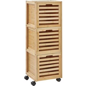 Bathroom Cabinet With Wheels. This functional bathroom cabinet is a perfect place for storing your bathroom essentials. 3 deep drawers provide plenty of space and additional rubber wheels allow you to move it around easily. Crafted from high-quality bamboo, it ensures durability and adds a cosy feel to any bathroom. Details: Product Type: Bathroom Cabinet Style: Boho General Color: Brown Material Type: Wood Main Material: Bamboo Wood Additional Material: Rubber Legs material: Synthetic Material Doors Opening: Standard Drawers: Yes Finish: Melamine Key Locked: No Number of Drawers: 3 Shelves: No Dimensions: Depth: 30 cm Width: 32 cm Height: 90 cm Weight: 7 kg Drawer Weight Capacity: 2 kg Top Weight Capacity: 3 kg Offer Includes: 1 x Cabinet Key Features: Modern Design, High-Quality Materials, High Durability, Plenty of Storage Space, Lightweight and Easy to Move Around Assembly Information: Partial Assembly Required. 20-40 min. Additional Information: Please note that wood is a natural