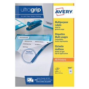These handy Avery Ultragrip multipurpose labels are compatible with most laser and inkjet printers, including multifunctional devices and photocopiers. Designed to be jam free, the labels provide reliable results with sharp prints and excellent adhesion. Ideal for a variety of labelling applications, these white labels measure 38.1 x 21.2mm. This pack contains 100 A4 sheets with 65 labels per sheet (6500 labels in total).