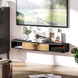 Elevate your living space with the floating TV cabinet. This chic wall mounted TV unit maximises upper space while offering lots of storage with two open compartments and a flip-up door cabinet. Manage unsightly cables easily with built-in management holes, ensuring your setup is tidy and stylish. Great for adding a touch of elegance with its black and natural wood finish.- Wall-mounted design maximises upper space, saving floor area; - Two open compartments for easy access to frequently used items; - Flip-up door cabinet hides clutter, maintains clean aesthetics; - Cable holes streamline cable management, reduce tangling; - Router hole enhances storage and signal reception; - Black finish paired with wood grain panel and gold-tone finger handle adds elegance; - Rounded corners designed to protect against injuries; - Assembly required;- Colour: Charcoal Grey, Nature Wood Finish; - Material: MDF; - Overall Dimension: 120W x 24D x 16H cm; - Cabinet Inner Size: 54W x 20D x 13H cm; - Open Compartment Size: 28.5W x 22D x 13H cm; - Router Hole Size: 22W x 2D cm; - Weight Capacity: 33 kg (overall), 15 kg (top), 8 kg (cabinet), 5kg (shelf); - Item Label: 83B-266V00CG; 17 Stories