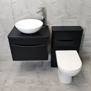 Aegean satin black wall hung bathroom vanity unit with a countertop Wok Basin & Tap Contemporary Handle-less design With a soft close drawer that can be used for storage With matching worktop Wall Hung Including Charlotte Wok style ceramic basin Including un-slotted basin waste Moonstone units are made in the UK Satin black finish Vanity Unit Sizes approx: Width: 610mm Depth: 450mm Height: 420mm (To top of Worktop) Height: 520mm (To top of basin) With matching 500mm WC unit Includes concealed dual flush cistern with Chrome flush button Echo D shaped back to wall WC pan High quality ceramic pan Modern style Including soft close seat Back to wall design to hide pipework High quality white gloss glaze Includes soft close seat Satin black finish WC unit sizes approx: Width: 510mm Depth: 200mm Height: 800mm D shaped toilet sizes approx: Width: 350mm Depth: 530mm Height: 400mm Amy Tall Basin Mixer Tap & Click Clack Waste included With Hydros Amy tall basin mixer tap Single lever control