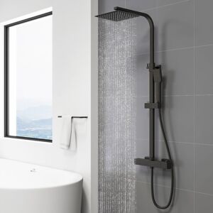 Specifications Product Name: Square Thermostatic Shower Set Valve: Brass Construction Anti-Scalding: Built-in Temperature Range: 20-85 degrees Celsius Dual Control: Constant Temperature and Water Flow Shower Head Size: 8 inches (200 mm) Shower Head: Chrome Plated Connector: Adjustable Swivel Slide: Solid Brass Adjustable: Yes Handle: Black Plated ABS Handle Hose: 1.5 m Nozzle: Easy Clean Rubber Nozzle Controls: 2 Accessories: Yes Size: UK Standard Size Warranty: 3 Years Package Weight: 3.8 kg Package contents: Thermostatic Mixer Lever Valve Lifting Lever Shower Head Hand Shower 1.5 m Shower Hose Accessories Included