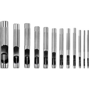 Features: 10 Piece Hollow Leather Punch Set, Sizes: 1, 2, 3, 4, 5, 6, 7, 8, 9, 10mm Heavy Duty Steel Punch Set, Made of Heat Treated Carbon Steel for Long-Lasting Cutting Edges Special Energy-Saving Design, Can Easily Cut Multiple Layers of Fabric For Punching Holes in Gaskets, Leather, Plastic, Rubber or Vinyl Recommended for Falconry, Hobbies, Crafts, Model Making, Home Repairs, etc. Specifications Material: Heat-treated carbon steel Hollow punch sizes: 1, 2, 3, 4, 5, 6, 7, 8, 9, 10 mm Head hardness: 48-55 degrees Includes: 10 hollow punch set