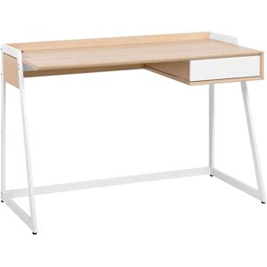 Modern Home Office Compact Desk. With a sturdy white frame and light wood finished worktop, this desk suits any modern interior style. Combining clean lines and a sturdy slim leg frame, it would suit an office space, children bedroom or a functional addition to a living area. Whether used for writing, drawing or a computer area, this desk offers a wide work surface, while a handy drawer allows for documents and personal items to be kept tidy and out of sight. A compact and functional piece of furniture which would freshen up your home office interior. Details: Product Type: Home Office Desk Style: Modern General Color: White, Brown Material Type: Wood Main Material: MDF Additional Material: Metal Legs material: Metal Top Material: Engineered Wood Drawers: Yes Finish: Powder Coated Number of Drawers: 1 Dimensions: Depth: 60 cm Width: 120 cm Height: 82 cm Weight: 27 kg Weight Capacity: 30 kg Offer Includes: 1 x Desk Key Features: Practical Drawers with Stable Mechanism, Adjustable Feet