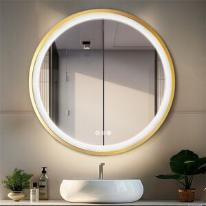 Innovative illuminated bathroom mirror in 24 inch, combining functionality, style, and sophistication. Round lighted bathroom mirror with a golden frame naturally draws the eyes. Having sensitive touch buttons to switch to between different lighting colors, from warm, cool white, to natural white lights, allowing users customize the ambiance and functionality of the bathroom. Wall-mounted, hung on the wall vertically with two pre-installed holes and brackets. Metro Lane Size: 80cm x 80cm