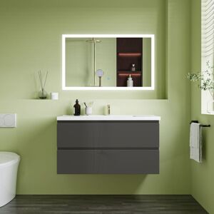 990*520mm Bathroom Wall Hung Bathroom Cabinet with Two Soft-close Drawers, Space saving, Ceramic Basin, Anthracite Durable, constructed from premium MDF board. IP44 Rated&waterproof. Convenient to clean and keep the bathroom tidy and organized. The dynamic curve design creates a distinctive bathroom atmosphere. Built-in practical shelves provide ample space for saving in the bathroom. Product details: Dimensions: H 520 x W 990 x D 445 mm Functional Configuration: 2 Soft-close Drawers & Ceramic Basin& Wall Hung Material: MDF board + Ceramic Color: High Gloss Anthracite Tap Hole: Yes Not Included: Waste and Tap Please Note: Dry with a clean cloth; Wipe clean with a soft rag dampened with water or a non-abrasive, neutral detergent or soap. Please do not book a plumber/fitter until you have received your items in satisfactory condition. Damages caused by 3rd party delivery companies are unfortunately beyond our control and we disclaim all liability. We are unable to ship items to the