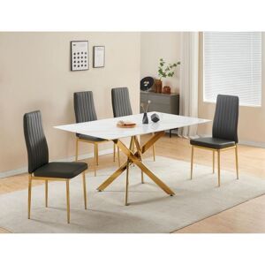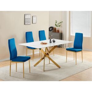 Elevate your living space with the Auric 6-Seater Dining Table, a stunning centrepiece crafted to infuse your home with elegance and modern sophistication. Perfect for any contemporary setting, this table boasts a white marble-effect 10mm tempered glass top paired with sleek, gold-finished metal legs — striking the perfect balance between luxury, durability, and safety. The 150 cm (L) x 90 cm (W) surface offers ample space for dining, while the unique nest-like metal leg structure not only enhances stability but also adds a bold and artistic statement to your décor. Equipped with adjustable levelling feet, the Auric table ensures a steady, wobble-free dining experience on any floor surface, making it as practical as it is stylish. Designed to comfortably seat up to six, it’s the perfect table for both everyday meals and special gatherings. Paired with the Auric table are the Glitz Dining Chairs — the perfect combination of comfort and chic design. Upholstered in soft-to-touch velvet,