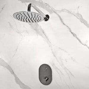 Dornach Concealed Thermostatic Shower Valve with Arm & 200mm Fixed Shower Head Dornach Concealed Single Function Control Shower Valve with Round Controls Single function thermostatic shower valve Modern shaped wall mounted valve Chrome finish Push button control Modern contemporary design Single flow control High quality Concealed valve hides pipework for clean minimalistic look 130mm x 190mm Pack includes; shower valve, backplate, handle & wall elbow Complete with 200mm round fixed head with wall mounted arm Chrome finish Manufactured from brass