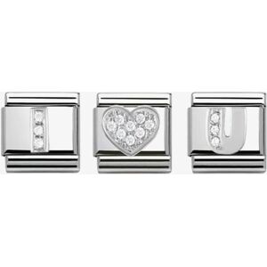 This stylish charm set from Nomination is the perfect way to say i love you. The trio of links spell out 'i love you' and are crafted from Stainless Steel with Sterling Silver and Cubic Zirconia detailing. Nomination Silvershine - Letter I Charm 330301 09 Nomination Silvershine - White CZ Heart Charm 330304 01 Nomination Silvershine - Letter U Charm 330301 21