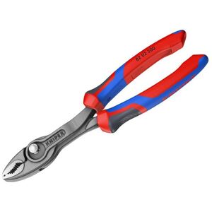 82 02 200 SB KNIPEX TwinGrip® Gripping, tightening and loosening screws with worn heads and threads. Unique combination: Front grip and side grip function, box joint, push button adjustment. High-grip front jaw with robust teeth and high gear ratio at the tip of the mouth. Very slim pliers let you work even in confined installation spaces with a narrow turning zone for fast results. Pinch stop reduces the risk of crushed fingers. Durable and resilient thanks to robust box joint. The all-rounder for all common tasks. With comfort handles: consisting of three ergonomic components for optimized handling and equipped with two KNIPEXtend interfaces for extensions. Large front and side gripping capacity for diameters and widths across flats 4 - 22 mm. Reliable, frontal gripping of flat workpieces up to 8 mm thanks to three-point system. Five-way adjustable slip joint with push button adjustment for precise adjustment of gripping capacity. - Adjustment positions: 5- Capacities for pipes
