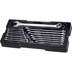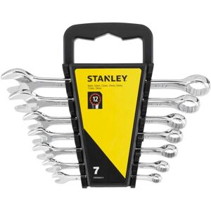 The STANLEY® Combination Wrench Set includes 7 pieces to cover a variety of large jobs. Forged in corrosion resistant chrome vanadium steel with a high chrome finish. The 12-point box end with 15-degree offset doubles the access angle and creates clearance for hands or obstructions in tight work spaces. Stored and organized in a durable rack with a space-saving foldable handle grip and keeps the wrenches tidy and in order. Sizes: 8,10, 12, 13, 14, 17, and 19mm.
