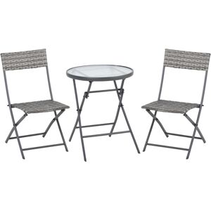 Outsunny's lovely bistro set brings your home decor a delightful upgrade. This foldable option not only provides compact convenience but also features a stunning woven look that instantly upgrades any existing decor. Made of steel frame and durable PE rattan wicker. Round table with tempered glass tabletop allows easy cleaning with a damp cloth, this set offers reliable durability that naturally withstands most weather conditions. Let this bistro set brings you a happy leisure time.Features:3 pieces bistro conversation set, including 2 chairs and 1 round coffee tableCombination of durable PE wicker and steel frame decorates your homeFoldable design, this set can save space of storage and facilitate transportationA round side table is convenient for you to place some drinks and snacksTempered glass tabletop allows easy cleaning with a damp clothPerfect for patio, balcony, terrace, garden, and so onNo Assembly Required