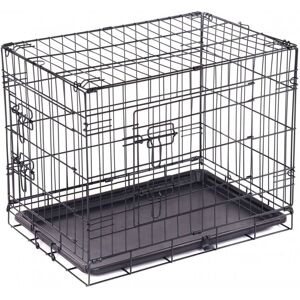 The folding metal dog cage is perfect for housebreaking puppies, transportation and training. The cage is fully foldable for transport and storage when not in use and features 2 secure locking doors. The cage is manufactured from high quality steel with a plastic coating, protecting the dog s teeth and also making it weatherproof. The cage also includes a removable, black plastic tray.