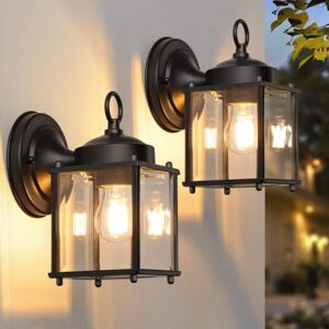 【Weatherproof】 Constructed of high quality metal and glass, making this outdoor wall light strong and durable, allowing it to withstand a variety of outdoor environments and weather conditions, no worry about rain, snow or sunshine. 【Unique Beveled Glass】 The black outdoor wall lights are designed with clear beveled glass, combining classic and sophisticated elements that bring an elegant appeal to your indoor and outdoor decor. Simply install the wall lantern anywhere you want. 【Rustproof Design】 Feature Made of high quality materials and rustproof finish, our outdoor porch light wall mount is rustproof and anti-corrosion, can be used for years. Suitable for entryway, door, garage, porch, foyer, hallway, patio, garden, street, etc. 【E26 Socket】The outdoor waterproof lights are compatible with E26 bulb types (max 60W, bulbs not included), such as LED, incandescent or CFL bulbs. The open-bottom design makes bulb replacement much easier.