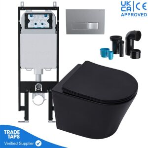 General Information Brand: TradeTaps Collection: Wall Hung Toilet, Slim Cistern Frame, Angled Connector Kit, Flush Plate Installation: Wall Mounted Available Options: Complete Set or Frame Only Toilet Highlights & Features Crafted from the highest quality heavyweight ceramic Luxury Matt Black finish Contemporary design influenced by soft chiselled edges & gentle curvature Hidden fixation assembly to maintain a minimalist aesthetic appeal Complete with matching sandwich toilet seat Soft-Close seat mechanism prevents slamming Quick-Release seat mechanism for easy access & cleaning All necessary installation fixings pre-supplied Toilet Size: (H) 370mm x (W) 365mm x (P) 485mm Cistern Frame, Connector Kit and Flush Plate Highlights & Features Introducing the slimmest wall hung toilet frame on the market! This ultra-sleek design is perfect for creating a modern space-saving look in your bathroom. The height adjustable feet provide flexibility when installing, while the single powder coated