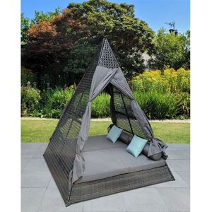 A beautifully crafted hand-woven rattan teepee style daybed in 8mm natural weave that will add the wow factor to any outdoor space! The Teepee Daybed combines traditional weaving with a stunning design to create a visually spectacular centrepiece for any outdoor space! Relax in style on this magnificent daybed, which comes with two large padded bottom cushions, two circular headrest cushions, and has built in curtains for extra privacy and shade. This set comes complete with removable and washable padded fabric cushions in beige. The ideal daybed for those looking to make an instant impact on their outdoor space. Relax and enjoy this truly stunning outdoor centrepiece! Key Features: High strength powder-coated metal frame. Hand-woven UV PE Rattan, durable and weatherproof. Padded fabric cushions. Removable and washable cushion covers. Stunning teepee design. Includes: 1 x Daybed, 2 x large bottom cushions, 2 x circular cushions, 2 x matching curtains. Dimensions: - 200cm W x 200cm D x