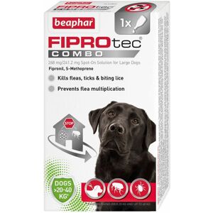 WHAT DOES THIS PRODUCT DO? Beaphar FIPROtec® COMBO Spot On Solution for Large Dogs contains Fipronil and the insect growth regulator S-methoprene which not only kills adult fleas, ticks and biting lice but also interrupts the flea life cycle therefore preventing any exposed eggs and/or larvae from developing in your home for up to 8 weeks. FIPROtec® COMBO for Large Dogs kills fleas for up to 8 weeks and ticks for up to 4 weeks. It is important to establish a regular flea control routine for dogs and the household. Dogs who spend a lot of time outside are especially at risk from fleas and ticks. Beaphar FIPROtec® COMBO for Large Dogs holds the legal category NFA-VPS and can only be sold by a suitably qualified person. WHATS IN THE PRODUCT? 268mg Fipronil, 241.2mg S-methoprene IS THIS PRODUCT SUITABLE FOR MY DOG? Suitable for dogs over 8 weeks of age and weighing more than 20kg HOW TO USE? Before use, read the package leaflet for full instructions and all warnings, including user