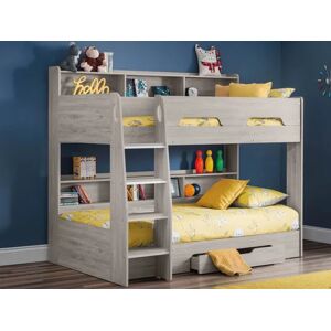 The Orion bunk bed from Julian Bowen is a contemporary, innovative bunk bed presented in a modern grey oak finish. It combines style with great practicality and includes a handy pull-out drawer and extensive shelving for kids39; books and toys, with a subtle raised lip to prevent anything slipping down the back. The lower bunk is positioned close to the ground, making it ideal for smaller children, while the robust ladder features attractive cut-out handles and optional glow-in-the dark strips on the steps for added safety. Please note: Bed frames are self-assembly and priced without mattresses..
