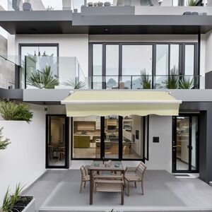 2 x 1.5m Yellow-Stripe Patio Manual Awning Features: -Recommend to fix on concrete wall. -With Steel Square Torsion Bar and Aluminium roller, more durable than other seller,no torsion bar awning. -With two heavy duty cables in the center joint of arms makes it easier to project and retract. -Side covers on the roller support makes your awning elegant looking. -The specially designed aluminium arms are adjustable to enable you to alter the slope of the awning from 5 degrees to a relatively steep tilt of approximately 35 degrees from the horizontal. -Retractable, can be opened as much or as little as you like up to the maximum projection. -Steel crank handle is on the left as you face the awning (same as shown in picture), and can not be moved to another side. Specifications: -Steel Square Torsion bar: 35x35x1.2mm -Aluminium front bar: 47.2x35.6x1.2mm -Aluminium support arm: 47x28x1.2mm, 37x20x1.2mm -Fabric material: PU coated water-resistant 300g/m2 polyester fabric. -A printing error