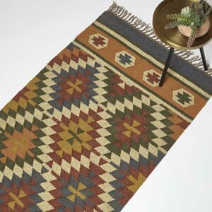 Specifications : Brand : Homescapes Colour : Blue and Orange Size : 66 x 200 cm, 90 x 150 cm, 120 x 170 cm, 160 x 230 cm, 240 x 300 cm Material : 75% Jute, 25% Wool Care Instructions : Spot Clean Only A colourful geometric style handwoven kilim rug with decorative fringe tassels. Blue, green, orange and red rug for living room, hallways and bedrooms. Vintage Rugs Handwoven from fair trade wool and jute, this colourful patterned rug is perfect for adding a splash of colour to bedrooms and hallways. Woven from shades of orange, red, green and blue, each wool and jute strand has been carefully hand-dyed to create a vibrant, on-trend rug that will suit any part of the home. Finished with off-white tassel detailing, this tapestry-style rug is both decorative as well as durable. Ideal for heavy footfall areas throughout the home, you can choose from several different sizes to suit your space: 80 x 180cm, 90 x 150cm, 120 x 170cm, 160 x 230cm and 240 x 300cm. Traditional Rugs A traditional