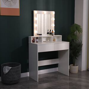 Transform your space with a touch of Hollywood glamour using this dressing table adorned with a circle of light bulbs. Featuring two spacious drawers and three open compartments, it allows you to keep your daily essentials organized and restore your room to a tidy appearance. The large mirror with lighting ensures clear visibility during makeup application, leaving no detail overlooked. Crafted with durability in mind, this dressing table is stable and sturdy, promising reliability for long-term use. 17 Stories