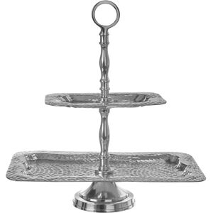 Ideal for serving cupcakes and baked desserts on gatherings, this cake stand will make a stylish centrepiece with its reflective silver polish. Its two different sized, rectangular tiers feature a hammered effect that gives them a decorative texture. A ring handle on top of the stand enables an easy lifting while a round pedestal keeps it stable on any table or countertop.