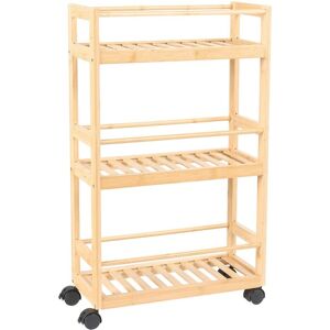 3-Tier Bathroom Shelving Unit with Wheels. Organise your bathroom space effortlessly with this stylish trolley, which combines functionality and elegance. Its long, narrow design allows it to fit seamlessly into any space, while three spacious shelves offer ample room to store and display your bathroom essentials. The warm bamboo wood adds a natural, inviting touch to your decor. Details: Product Type: Bathroom Shelf Style: Minimalist General Color: Brown Material Type: Wood Main Material: Bamboo Wood Shelves number: 3 Finish: Clear Varnish Dimensions: Depth: 20 cm Width: 45 cm Height: 75 cm Weight: 2.5 kg Shelf Weight Capacity: 3 kg Offer Includes: 1 x Shelving Unit Key Features: Portable Thanks to Swivel Castors, Natural Wood Grains and Knots Make Each Piece Unique, Decorative Yet Functional, Damp-Proof and Easy Care Material, Solid Workmanship Assembly Information: Full Assembly Required. 20-40 min. Additional Information: Please note that wood is a natural product, therefore each