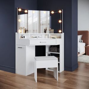 ELEGANT Corner Dressing Table with LED Mirror Lights and Stool, Movable Triple Mirror, 3 Open Compartments and 2 Drawers, Perfect for Girls, White This corner dressing table's compact design is a perfect space saver, perfect for small corners. It offers ample storage for makeup, jewelry, and other personal items, keeping your desk neat and organized. Three adjustable mirrors on each side provide a full view. Hollywood-style LED mirror lights provide bright, soft illumination, illuminating your makeup from various angles for a more precise and convenient application. This dressing table impresses with its elegant design, featuring a smooth, glossy white tabletop that radiates a simple and modern atmosphere. The frameless mirror design not only enhances the aesthetic but is also easy to clean, saving time and energy. Whether for makeup, dressing, or daily organization, it provides you with a comfortable and efficient workspace. Features ⭐【 Mirror light Multi-Mode 】 - Hollywood-style LED