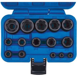 A set of heavy duty Star* profile impact sockets, from sizes E24 to EP32, for use on Torx fixings. These 3/4""D sockets are ideal for commercial vehicle maintenance and other heavy duty applications. They are manufactured from chrome molybdenum with a matt silver finish, and come supplied in a robust metal storage box with a EVA foam insert to keep them organised. Set of 3/4""D x Star* impact sockets, each with a drilled collar to accept retaining pin or detent ball. Sizes: E24, E26, E28, E30, E32. Manufactured from impact quality chrome molybdenum (SCM440) with a matt silver finish. Supplied in a metal storage box with a EVA foam insert. Star* is the equivalent to TORX� - 6 sided. TORX� and TORX PLUS� are registered trademarks of Acument Intellectual Properties, LLC.
