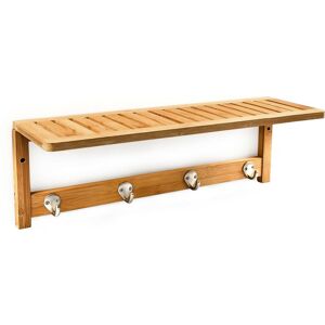 A little extra storage space never goes amiss! This wall-mount shelf with practical hooks can provide some much needed storage space to any small bathroom. Place towels, cosmetics or deco items on the shelf, and the 4 hooks can be used to hang up wet towels or to hang articles of clothing. The wall rack is make of natural bamboo for a warm and elegant look in your bathroom or coat rack in your hallway. Bath Rack Details • Size: approx 50 x 18 x 16 cm • Holds up to 10 kg • Weight: approx 0.8 kg • Made entirely of moisture-resistant bamboo • Hooks made of matt metal • Natural wood grain pattern Wall-Mount Shelf Practical Storage Space • Wall shelf with hooks • Space-saving alternative for small bathrooms as the shelf and hooks take up practically no room on the wall • Quick and easy wall-mounting • Can also be used as a decorative coat rack in the hallway • Lovely wood for a cosy atmosphere Included in Delivery • Wall rack with hooks • Mounting materials and instructions • Decorative