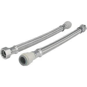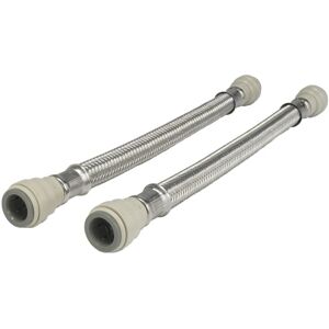 JG Speedfit x union nut flexi hose (braided) for the connection of pipe to a male thread appliance, such as a tap. Simply push the push-fit fitting fully onto the pipe and screw the nut onto the thread of the appliance. To demount the push-fit end, push the collet towards the body of the push-fit fitting and pull the pipe release. The JG Speedfit x union nut flexi hose is quicker and easier to install in confined spaces than traditional methods as it eliminates the need for hot works or tools. Designed, manufactured and assembled in the UK. An alternative to hard piping to a tap or fixture Flexible design makes installation hassle free Safe flame-free installation, with no hot works, glue or flux Braided stainless steel outer layer protects the internal feed from damage Grip & Seal collet with stainless steel teeth and main O-Ring seal Compatible with Speedfit PEX and polybutylene plastic pipe (inserts required) and copper pipe Suitable for hot and cold water only (6 Bar @ 65 °C)