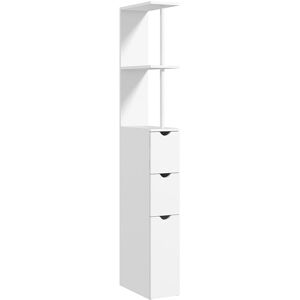 Tall, narrow and stylish - what's not to love about this HOMCOM bathroom cabinet. Providing handy storage in a slim design, this piece is suitable for smaller spaces - bringing you storage into even the smallest spots. Comes with two top shelves (great for towels), small cupboard and two bottom drawers (great for hygiene and cleaning products). Comes with anti-tipping straps to attach to a wall for safety. Specifications: ● Colour: White ● Material: MDF ● Overall Dimension: 15W x 33D x 136.5Hcm ● Open Shelf Size: 15.3W x 32.3D x 28Hcm ● Drawer Inner Size: 10W x 27.5D x 8Hcm ● Weight Capacity: 5kg ● Item Label: 834-114V80WT Features: ● Tall, slimline profile: great for smaller spots ● Features two open shelves, small cupboard and two drawers ● Robust MDF structure, with two outer support poles ● Anti-tipping straps for safety ● Maximum load 5kg, assembly required.