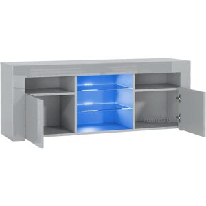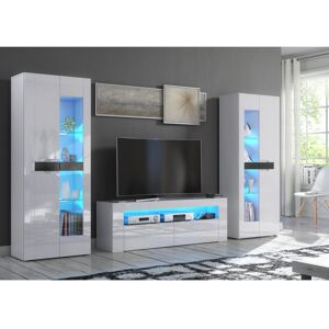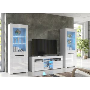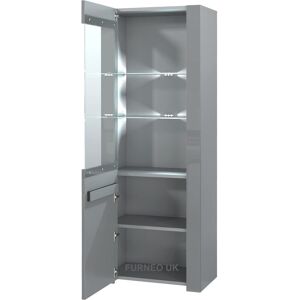 This living room set features a TV unit and two display cabinets, with front panels and doors in high gloss, and body (top, sides and inside). The TV unit is characterised by two cupboards and three open spaces ideal for the storage of media units, and two glass shelves. Suitable for TV's up to 55in. The display cabinets feature a glass fronted door that opens to the left. They have two glass shelves and two wooden shelves below. Blue LED lights are included with each item, they are mains powered with a UK power adapter. The foot switch is used to turn them on and off. Note that these are flatpack items and will require assembly. Picture instructions, and supplementary notice are included, and should be looked over carefully, prior to attempting assembly. Furneo Colour: Grey