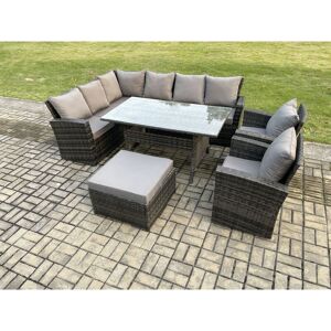 This classic high back sofa can accomodate 8 peoples and has a comfortable and soft back, made of new premium dark grey mixed PE rattan Set Dimensions: • 3 Seater sofa with two arm : 170L x 69D x 79H cm • 3 Seater sofa with single arm: 160L x 69D x 79H cm • 1 pc rising dining table: 140L x 80W x 68/48H cm (height up 68,down 48) • 2 pc Fully assembled small footstool :40L x 40W x 34H cm Dark grey mixed rattan with dark grey fabric .Color may Vary due to light or monitor .we are unable to return the item due to this problem .Please Consult Before Purchase if you have requirement on color saturation. Table Can Be Used Both For Coffee Or Dining Table,Great Price Compared With Other Online Or Offline Store For Rising Table Set Items Comes Flat Packed And Easy to Assemble,Sturdy Galvanized Steel Tube Metal Frames With Powder Coating To Prevent Rust, Ergonomic High Back And Declining Design For More Comfort Flat PE Rattan Completely Made By Hand, 5mm Thick Transperant Tempered Glass With