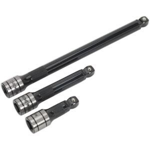 Sealey Premier Black Wobble/Rigid Extension Bar Set 1/2"Sq Drive 3pc Features: Heat treated and hardened Chrome Vanadium steel shafts. Fully polished black chrome finish with machined and lacquered heads. Cut-away tips allow sockets to be driven with shaft offset of up to 10°. Deep knurling on shafts allows extra grip when spinning off fixings. Spring-ball socket retainers. Technical Details: • Heat treated and hardened Chrome Vanadium steel shafts. • Fully polished black chrome finish with machined and lacquered heads. • Cut-away tips allow sockets to be driven with shaft offset of up to 10°. • Deep knurling on shafts allow extra grip when spinning off fixings. • Spring-ball socket retainers. • Lifetime guarantee*. • Model No. AK7692 • Model No. AK7692 Additional Information: • One of a comprehensive range of Premier Hand Tools, suitable for daily professional use. • Heat treated and hardened Chrome Vanadium steel shafts. • Fully polished black chrome finish with machined and