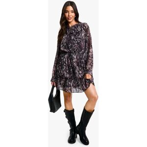 Floaty chiffon blouse with striking snake print pattern throughout Feminine V-neckline with delicate tie detail for adjustable styling Dramatic tiered ruffle sleeves adding movement and dimension Cinched waist design creates a flattering silhouette Relaxed fit with gentle peplum shape for effortless comfort Make a statement in this eye-catching chiffon blouse that combines bohemian flair with contemporary styling. The lightweight, semi-sheer fabric drapes beautifully whilst the cinched waist creates definition and shape. The standout tiered ruffle sleeves add drama to this otherwise relaxed piece, making it perfect for day-to-night transitions. Style with distressed wide-leg jeans and flat boots for casual weekend brunches, or tuck into a leather mini skirt with heeled ankle boots for evening drinks. The versatile V-neckline can be worn tied for a more demure look or slightly open for a relaxed vibe. This Boohoo blouse is the ideal addition to your wardrobe for those moments when you want to feel effortlessly stylish whilst maintaining comfort.