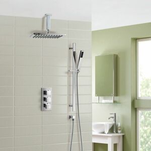 Thermostatic Valve Top dial - controls to one water diverter Middle dial - controls water temperature Bottom dial - controls to one water diverter High-Quality Design Chrome Finish Thermostatically controlled Manufactured from highly durable brass Operating range 20 - 50 deg C with 38 deg C safety button Built-in non-return valves to prevent backflow and filters to protect the thermostatic mechanism Chosen temperature maintained to within +/-1ºC Pre-set maximum temperature Automatic shut off in event of water cold supply failure UK standard size fitting Shower Head With Ceiling Arm Details Showerhead dimensions - 200mm x 200mm Chrome Finish Solid Brass Arm Length - 120mm Subject to a minimum of 1.0 bar water pressure Suitable For The Following Water Systems Combi-boilers Gravity Fed systems MegaFlow Systems Pumped systems Un-vented systems Pressurised cylinder systems Subject to a minimum of 1.0 bar water pressure Package Contents Thermostatic Valve Shower Head Shower Rail and Handset