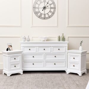 This is our Daventry White Chest of Drawers a stunning piece of furniture in a large design that fulfils your bedroom storage needs with added beauty. In a striking white painted finish with simple clear lines that will not only complement your décor but add a feeling of light and space with the crisp clean white colour. This chest of drawers is a fantastic extra-large size with 7 drawers in a 3 over 4 design offering ample storage for all your clothing storage needs. Offering the perfect balance of extra storage space and classic country elegance a great choice for your bedroom. The Daventry White chest of drawers comes fully assembled so no need for fiddly instructions and time spent fitting it together just unbox and place where you want to create to best living space for yourself. The chest measures a super 120cm x 77cm x 42cm (Width x Height x Depth) with the 3 top drawers each measuring 31cm x 12.8cm x 27.6cm (Width x Height x Depth) and the bottom 4 drawers measuring 49cm x 12.8cm x 27.6cm (Width x Height x Depth) Want to view all items within this range? Browse our Daventry White Range for more options. Colour: White Finish: Painted Material(s): Wood Metal Material type: Hard Wood 120cm x 77cm x 42cm (width x height x depth) Measurements (other): Inside smaller drawers are 29.8cm x 32cm with a depth of 12cm and comes out to 23.4cm including the frame and 20cm without. Inside larger drawers are 47.7cm x 33.2cm with a depth of 12cm and comes out to 24cm including frame and 22.2cm without. Fully assembled