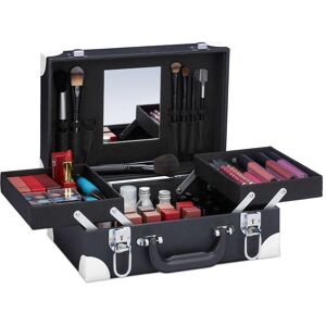 Keep your beauty essentials in view with this black leather-look make-up case. The 3 large interior compartments offer plenty of space to store make-up, nail polish, styling products and more. There is also space for up to 7 brushes in the holders next to the mirror in the lid. The 2 locks ensure that the contents of the make-up organiser are kept safe and secure, making it the perfect travel companion. Nail Polish Case Details - Overall dimensions H x W x D: approx. 12.5 x 31 x 23 cm / approx. 1.4 kg - Weight: approx. 1.4 kg - Material: Plastic, Polyester, Glass - Colour: Black, white, silver Other Dimensions of Cosmetic Organiser - Dimensions when unfolded H x W x D: approx. 29 x 46.5 x 28 cm - Dimensions of mirror H x W: approx. 12 x 10 cm - Dimensions of fold-out compartments H x W x D: approx. 3 x 13 x 18 cm each - Dimensions of large compartment H x W x D: approx. 7 x 30 x 19 cm Lockable Make-up Case with Mirror - 3 compartments and 7 brush holders offer plenty of storage space