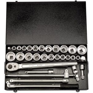 Description générale This is a professional-quality socket set designed for both metric and imperial measurements. Made from durable chrome vanadium steel, it is hardened, tempered, and chrome plated to resist corrosion. The set includes a variety of sockets, extensions, and accessories suitable for various DIY and home improvement tasks, all stored in a sturdy steel case for easy organization and transport. Spécifications techniques Number of pieces: 31 Materials: Chrome vanadium steel, chrome plated Sockets: 11 metric (19-50mm), 11 imperial (3/4" to 2" AF) Additional tools: Reversible ratchet, sliding 'T' bar, flexible handle, universal joint, extension bars (100mm, 200mm, 400mm), converters (3/4" to 1/2" and 3/4" to 1") Compatibilité et accessoires Compatible with various socket sizes for different fasteners Includes adapters for converting between different drive sizes Suitable for use with standard ratchets and extension bars Installation No installation required. The set is