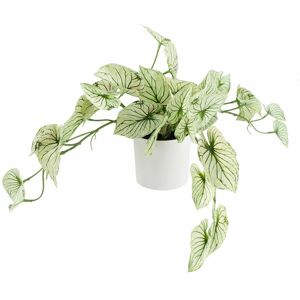 Genuine Leaf product. A realistic artificial alocasia plant. Comes potted in a white plastic decorative pot, ready to display. Leaves and stems are plastic and these trail slightly so this looks perfect sitting on a shelf or cabinet. As we have it arranged in our photos this plant measures 30cm tall x 50cm x 40cm. The small decorative pot measures 9cm (w) x 9cm (h).Part of our range of realistic plants and trees.