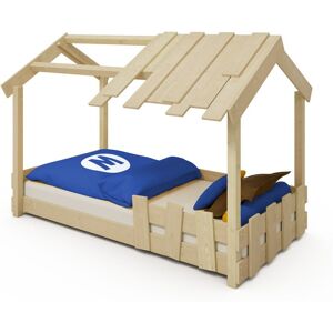 Kids loft bed with angled cottage Wickey CrAzY Hutty CrAzY Hutty, that’s the name of the secret …. In the large fairytale forest that the little witches and wizards can only reach by flying car and following the signs. Once they arrive, they buy delicious potions over the counter and climb up the ladder to the magic bed. Here, the witch unpacks her book and tries the most exciting spells. After an eventful day, the little magicians put their spellbook in the multi-loop hang bag and fall asleep under the charming wooden roof. Sweet dreams, Wickey! Product details CrAzY series Nordic pine/spruce Natural and untreated wood Solid boards 18x120 mm Main support beams 58x58 mm Mattress area 200x90x12 cm Quality and safety tested Can be assembled mirror-inverted Fantasy tarpaulin to paint on, washable You can cut the Multi-Loop hanging bag and CrAzY seats to size yourself as desired You can cut the Fantasy tarp and sticker film to size yourself depending on the design DIY skills are a benefit