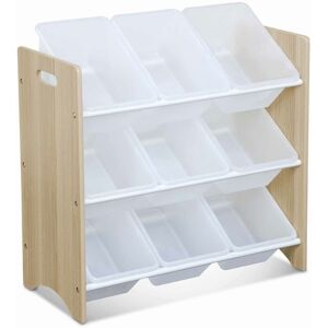 Product benefits Wooden frame At child's height 9 storage compartments included The Tobias storage unit is ideal for easily storing your child's things. Its soft colour will look great in your little one's bedroom. It comes with 9 storage compartments that can be stored on three levels. It also has two side handles for easy movement. Colour: White and natural wood Material of racks: Plastics Tube material: Metal Structure: MDF Cabinet dimensions : L64 x W29.5 x H60cm Tube dimensions : 61.3 x Ø1.5cm Tube thickness : 1mm Shelf dimensions : L40 x W40 x H1.2cm Dimensions of side panels : L60x W29.3x H1.2cm Handle dimensions : 10x3cm Rack dimensions: L29 x W20 x H13cm Maximum capacity: 5.5L per rack Maximum weight supported : 3kg per crate Weight : 5kg Sold as a kit Instructions included