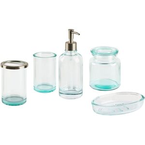 Fluted Bathroom Essentials Set. This 5-piece set of assorted accessories is just what every bathroom needs. Comprising a toilet brush, a dispenser for liquid, a soap dish, a tumbler and a toothbrush holder, it will help you keep your things in order. Made from polyresin the pieces feature a fluted texture that gives them an elegant character. Details: Product Type: Bathroom Accessories Set Style: Modern General Color: Green, Silver Material Type: Synthetic Material Main Material: Polyresin Additional Material: Synthetic Material Finish: Painted Dimensions: Overall Dimensions: 10x10x37 Weight: 1.8 kg Offer Includes: 1 x Toilet Brush, 1 x Tumbler, 1 x Soap Dispenser, 1 x Soap Dish, 1 x Toothbrush Holder Key Features: Keeps your Bathroom Neat and Well-Organised, Effortless Liquid Dispensing Thanks to a Smooth Pump Mechanism, Toilet Brush Designed with Firm Bristles for Thorough Cleaning, Tumbler Ideal for Rinsing or Storing Everyday Essentials, Unique Handmade Piece, Exceptionally Easy