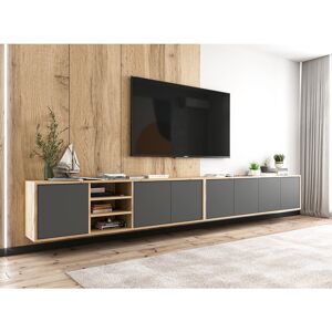 A two-tone colour palette, streamlined silhouette, and wall-mounted design give this TV stand its urban flair. Adding a dash of modern style to its surroundings, the stand features three shelves and three cabinets ideal for storing a media library, electronics, and more. Assembly is required. Ebern Designs Colour: Oak/White Matt