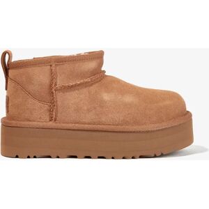 UGG reconceptualise iconic designs into sleek modified prototypes. These classic ultra mini platform chestnut boots are reflective of the Californian label's high quality craftsmanship and innovative outlook. Engineered with suede uppers, an asymmetrical topline, and overlock stitch detailing on the seams. There is the classic foam footbed and EVA Sugarcane outsole to provide comfort and effortless style. • Rear Pull Tab• 17mm UGGplush™ 60% Upcycled Wool, 40% TENCEL™• Lyocell Lining • 17mm UGGplush™ 60% Upcycled Wool, 40% TENCEL™ Lyocell Insole Textile Binding• 100% Recycled Polyester Fibers• 1.5” Heel Height• Woven Heel Label With The UGG® Logo